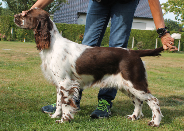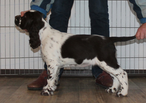 Skadi übertrifft meine Erwartungen bei weitem, jetzt im Alter von sechs Monaten ist sie sehr reif, sehr fleissig, sehr ballverliebt, gehorsam und verschmust obendrein. Sie ist ein hübsches kleines Springermädchen, das bisher sehr harmonisch gewachsen ist, mit auffälliger Knochenstärke, Substanz und Tiefe.
