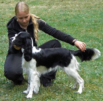 17.08.08 V2 und JCAC-Reserve für SS Cougar Einen 10 Monate alten Sportie im Ring zu bändigen und vorteilhaft zu präsentieren ist die leichteste Aufgabe nicht.;-) Die Besitzerin von SS Cougar, Ursel Milke, zeigte heute bei der SZS der "AG andere Spanielrassen" in Krefeld wie man´s macht und kam aus einer mit drei Rüden besetzten Jugendklasse mit dem freudigen Ergebnis V2 unter dem Richter J. Guillamon (E) heraus. Cougar und Ursel haben ihre Sache hervorragend gemacht und sich als "lernwillige Greenhorns im Showring" nicht unter Wert verkauft, was ich persönlich begutachten durfte. Ich bin ganz stolz auf "C-chen Rüde Nr1" und so dankbar, dass er seinen Fähigkeiten entsprechend gefördert wird. Danke, Ursel! |