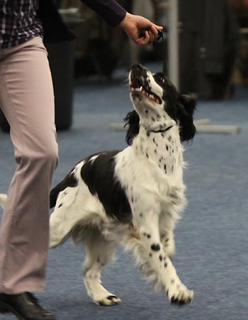 07.03.2010 SRA Soest: Sporties Rudel auf der Jagd nach vv´s und V´s Eine kleine Sensation für mich: Vier "Welpen" meiner Zucht versammelten sich heute auf die verschiedenen Klassen verteilt auf der Spezialrasseausstellung in Soest. Der Tag begann wie immer mit den Jungs: English Springer Spaniel Rüden Jüngstenklasse: Sporty Springers Firefox (Pommes) vielversprechend 1 mit diesem Bericht: Pleasing tricolour puppy, Excellent head, well constructed front, excellent bone, Nice body, topline and quarters, moved ok. (Foto unten) Danach kam der nächste Sportie in der Zwischenklasse Rüden : Sporty Springers Dallas Desperado Vorzüglich 2 Res. Anw. Dt Ch. VDH (Foto oben) Nun zu den Mädels ebenfalls Jüngstenklasse diesmal Hündinnen Sporty Springers Flirty Flake vielversprechend 2 mit dem folgenden Bericht: Lovely feminine puppy, super head and eye, excellent neck and shoulders, nice bone, very good quarters, moved well, just needs to develop all through to complete the picture. Mittlerweile ein "alter Hase" im Showbiz machte auch Amber ihren Job im Ring sehr gut. Zwischenklasse Hündinnen: Sporty Springers Energía bekam Vorzüglich3 von sechs anwesenden Hündinnen. Zuletzt als "Ehrensportie" ging meine Desperados Undis in den Ring der offenen Klasse Hündinnen und erreichte unter fünf Hündinnen Vorzüglich 2 Res Anw. Dt Ch. VDH mit diesem Bericht: Very Good Head, nice shoulders, bone and feet, very good ribs, well muscled quarters, sound,stylish mover with excellent side profile. Die Berichte des Richters Mr Armstrong (GB) lesen sich sehr schön und ich bin sehr zufrieden mit den Ergebnissen. Mein Dank geht an die Aussteller: Jürgen Koppenberg (Pommes), Heidi Krüper (Dallas), Andrea Ossenkemper (Flake) und last but not least Natalie Bökenkamp (Amber). Darüberhinaus hatten wir vielen netten Besuch bei unserem "Heimspiel" unter anderem SS Firebird (Falk) der sich am Ringrand schon ganz abgeklärt verhalten hat und dem ganzen Spektakel von Ferne zusehen durfte.