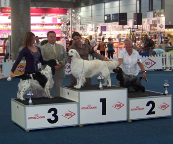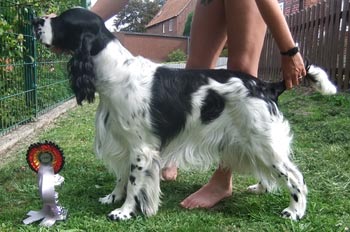 01.08.2011 ein frischgebackener Deutscher Champion und ein BOB Zu meiner grossen Freude durfte ich dabei sein als SS Energía das letzte VDH CAC für den Titel deutscher Champion VDH bekam. Sie gewann gestern bei der Nationalen Rassehundeausstellung in Bremen die offene Klasse Hündinnen mit V1 und eben dem passenden CAC, ein Jahr nach dem Erreichen des ersten CAC. Ich bin sehr stolz auf meinen ersten Sporty Springers Champion :-) Herzlichen Glückwunsch an Ambers Besitzerin Natalie Bökenkamp! Mein Cinco heimste sein drittes VDH CAC ein, bekam auch das Klub CAC, wurde bester Rüde und Rassebester. Am Samstag bei der Internationalen sah das Ganze ein wenig anders aus. Hier bekam Cinco V2 mit Res VDH CAC, Amber Sg1 der Lichtblick am Samstag war die Firefox Tochter Felicitous Africa die ein vv1 in der Jüngstenklasse erhielt. nachträglicher Geburtstagsgruß und schon wieder kann ich nur noch nachträglich gratulieren. Am 30.07. hatten die F-röschchen ihren zweiten Geburtstag. Lotta, Emma, Flake, Fire, Falk, Laurin, Jamie und Pommes alles Gute zum Wiegenfeste. Bleibt weiterhin gesund und macht euren Menschen weiter so viel Freude bei euren gemeinsamen Aktivitäten!