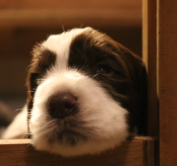 Die S-nuggles sind mitsamt Wurfkiste umgezogen ins Welpenzimmer. Sie verlassen jetzt die Kiste zum Fressen auf den eigenen kleinen Pfötchen. Nach dem Fressen machen die Mutigeren Entdeckungstouren durch den Welpenraum. Die anderen streben zurück in die Kiste, den sicheren Hafen.