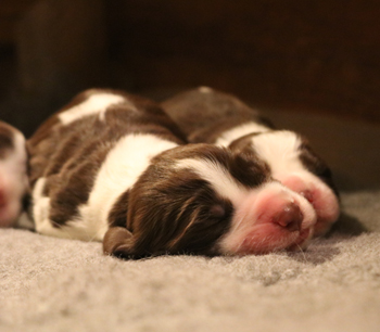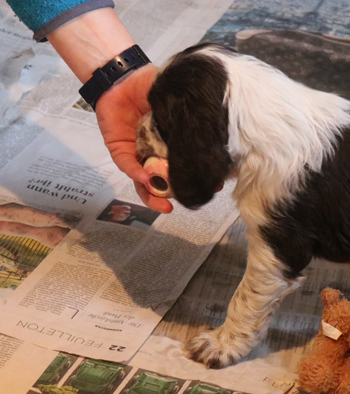 Fünf Mahlzeiten für S-nuggles strukturieren unseren Tag. Und die Zwerge spucken nicht ins Essen, der Napf wird nach guten zehn Minuten blankgeleckt wieder abgeräumt. Auch für die Zukunft ist vorgesorgt, am Freitag kamen die Palette Welpenfutter und auch gleich die Welpenpakete für die neuen Familien an. Wir arbeiten also ambitioniert am Idealgewicht für kleine Springer. In Zahlen heisst das, jedes einzelne S-nuggle nimmt pro Woche hier im Durchschnitt ein kg Körpergewicht zu. Und ca zwei kg Welpenfutter werden pro Tag verfüttert. Auch Hundekekse haben die Zwerge schon probiert. So kann ich ihnen den Zwangsaufenthalt in der Wurfkiste schmackhaft machen, während ich den Welpenraum wische. Die kommende Woche soll trocken aber kalt werden, ich denke wir nehmen uns mal vor den großen Garten bis Ende der Woche kennen gelernt zu haben. Allerdings geht das aufgrund der Witterung immer nur in maximal 30 Minuten Abschnitten.