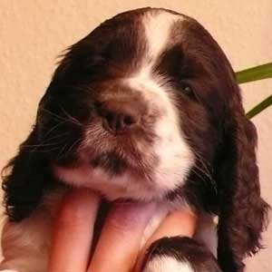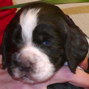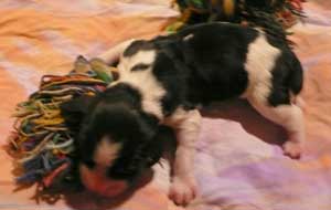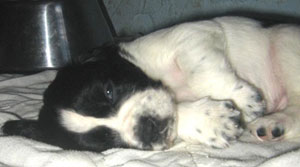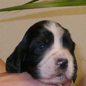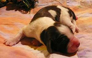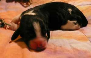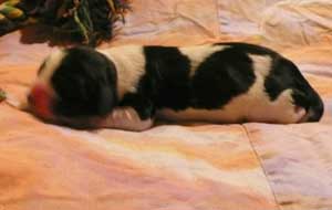 um 01.10 Uhr ein Welpe (Nr 7) in intakter Fruchthülle mit seiner eigenen und der fehlenden Nachgeburt im Schlepptau entgegen. Auf den ersten Blick zu sehen ist, die Farbe: schwarz! zur Geschlechterkontrolle müssen wir das Auspacken, Abnabeln, Lecken und den ersten Schrei abwarten. Was für ein Glück- zum guten Schluß : die schwarze Hündin. Sie hat eine schmale asymmetrische Blesse einen langen blitzförmigen weißen Fleck auf dem Rücken und einen weißen Kragen. Mit 350g ist sie die schwerste der Hündinnen.