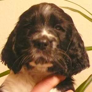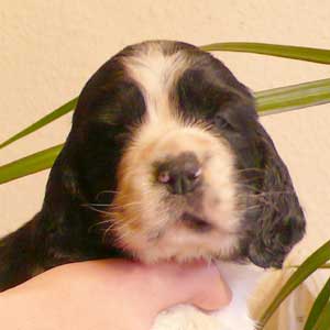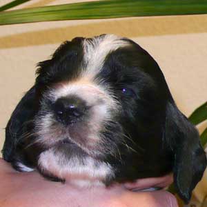 Mit dem Start in die dritte Lebenswoche befinden sich die Welpen jetzt in der sogenannten Übergangsphase, die Augen öffnen sich (Bild rechts Rüde Nr 6 bei dem man das Öffnen der Augen zuerst beobachten konnte, am 14. Tag) und auch die anderen Sinne erwachen. Ein vollständiges Sehen und Hören ist allerdings erst zum Ende der Übergangsphase, also zum Ende der dritten Woche zu erwarten. Die C-chen sind jetzt recht flink auf den Beinen und wenn Mama Joy in der Wurkiste zur Säuberung umherwandert wuselt ihr die Bande schon schnell um die Pfoten, um die Zitzen zu erreichen. Das klappt natürlich noch nicht bei der stehenden Hündin, aber einen Versuch wagen sie gern. Gestern zum 14tägigen Geburtstag startete die erste Entwurmungskur. Die Babies bekamen aus einer Pipette das Wurmmittel in die Mäulchen geträufelt. Das Gezappel auf dem Arm der Hilfsperson hielt sich in Grenzen, aber spucken konnten sie alle wie die Lamas :-) Beim "Geburtstagswiegen" konnte ich bei drei Welpen schon das kg verzeichnen. "Mr Big" (Rüde Nr 3) wird ja schon seit dem 11.Tag vierstellig geführt, seine braunen Schwestern überschritten die magische Grenze zwei Tage später. |