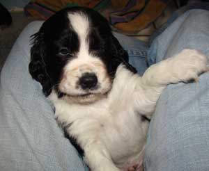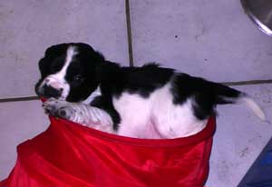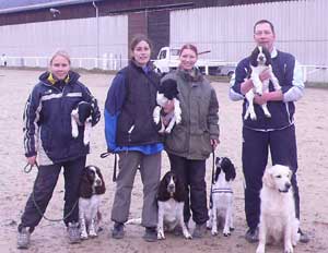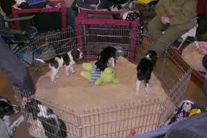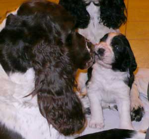 Unverhofft kommt oft... Nachdem die HD-Röntgenergebnisse des B-Wurfes vorlagen und die ersten Welpeninteressenten sich ernsthaft angemeldet hatten, ging es los mit der Suche nach dem passenden Rüden der Vater des C-Wurfes werden sollte. Recht früh schon hatte ich mich festgelegt auf einen in Schweden beheimateten "Briten" der in meinen Augen allen Anforderungen entsprach, und von dessen Nachkommen ich begeistert bin. Doch dann Ende April hatten wir endlich die Möglichkeit unsere Hunde per Gentest auf ihren PRA Status untersuchen zu lassen. Die Ergebnisse dieses Tests stellten meine Planungen leider in Frage- nun war guter Rat teuer und kostete mich einige schlaflose Nächte. Mir war klar, dass die Tests eine Weile brauchen und die Auswahl an getesten Rüden zu klein sein würde für eine Entscheidung mit der ich hundertprozentig zufrieden sein könnte. Im Laufe dieses Prozesses "stolperte" ich förmlich über den jungen Rüden "Barnie vom Soestbach" der mich, als ich ihn kennenlernte, mit seinem jugendlichen Charme einfach um den kleinen Finger wickelte. Zunächst wollte ich ihn einfach interessehalber anschauen, um ihn eventuell für einen späteren Wurf einzusetzen. Auf Anhieb war mir klar, dass er für Joy "Mr Right" ist, denn seine absolut führerweiche Persönlichkeit setzt einen überaus erwünschten Kontrapunkt zu Joys "Starletmentalität". Nun gut, Barnie wurde zunächst im Gedächtnis abgespeichert für später und ich war innerlich immer noch auf dem Weg nach Schweden. Aber ich hatte meine Rechnung diesmal ohne Joy gemacht und sie erinnerte mich daran, dass sie auch noch ein Wörtchen mitzureden hat- sie wurde einfach zu früh läufig. Absolut überzeugt von der Pünktlichkeit meiner Hündinnen in diesem Bereich hatte ich zuvor schon mit einer Freundin eine Wette gewagt, dass Joy am 25.07. läufig würde und ich am 04.08. meine Reise antreten könnte. Pustekuchen- sechs Tage zu früh war Joy unübersehbar "in Season": ich hatte eine Flasche Champagner an Marion verloren und zum Zeitpunkt der "Stehtage" eine ferienbedingte Urlaubssperre. Also hat wieder Joy entschieden wer der Vater ihrer Welpen wird:Barnie vom Soestbach .