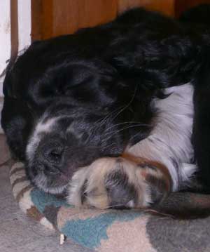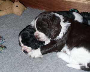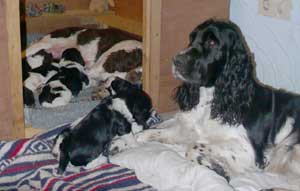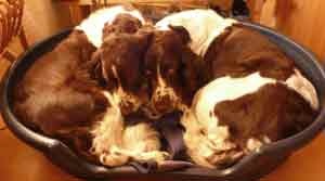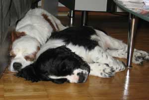 Joy (rechts) nimmt derzeit zweimal soviel Raum ein wie ihre Mutter Nova (links) -selbstverständlich stehen hier mehr Hundekörbchen, Betten oder Sofas zur Verfügung, aber als Springer liegt man halt gern im Knäuel |