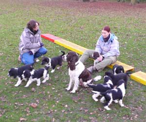 Ein ereignisreiches Wochenende liegt hinter uns. Cobain und Crazy begleiteten uns zu ihrem zweiten Agilityturnier. Dort war viel Zeit und Raum mit Schwester Kiwi zu spielen und auch andere Hunde kennenzulernen. Wieder konnten sich viele Hundler für die süßen Springergesichter erwärmen und unsere Bande mußte bei jedem Gang hinaus mehrere Begrüßungspausen einlegen. Da ich bei bereits seit Samstagmorgen nur noch für Cobain verantwortlich war, startete direkt sein Stubenreintraining unter meiner Aufsicht. Crazy konnte sich schon am Samstag an Gil gewöhnen (oder doch andersherum?) und war auf Anhieb Sandras Hund ohne zu murren :-). Vor der Rückfahrt liessen wir die Zwerge sich noch lange auf dem Reitplatz müde spielen, damit für Sandra die Fahrt nach Potsdam möglichst ruhig verlaufen konnte. Cobain fuhr zurück in der Autobox gemeinsam mit Mama Joy und man hörte keinen Piep von ihm. Crazy allein in ihrer Box im fremden Auto ging, wie Sandra berichtet, alle Tonlagen einmal durch, versuchte sich in Brüllen, Jaulen und Heulen und schlief erst ein als ganz klar war das alles keinen Erfolg hat. Sonntags kam dann für mich die schwere Stunde: Abschied vom letzten Mohikaner. Auch seine neue Familie macht mir die Sache so leicht wie es eben geht. Fünf freudestrahlende Gesichter zwei davon mit großen Plänen für eine Sportkarriere im GHSV Issum zogen von dannen mit meinem kleinen Kerlchen. Jedoch werde ich auch Cobain beim Jahresabschlußessen wiedersehen. Denn schon in drei Wochen werden sich einige der C-chen Besitzer mit uns "Alteingesessenen" Sporty Springers treffen und wahrscheinlich viel zu erzählen haben von den Taten und Untaten ihrer neuen Familienmitglieder.