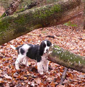 Meine verbliebenen drei Musketiere und ich geniessen die Zeit die wir noch gemeinsam haben. Am Morgen vor der Arbeit ist Spielstunde en famille angesagt. Mama Joy, Oma Nova und Undis bringen gemeinsam mit mir die Bande in den Tag. Am Vormittag gibt es einen Betreuerwechsel und Halbschwester Fine tollt ausgelassen mit ihnen durch den Garten. Am Nachmittag steht ein Spaziergang gemeinsam mit Undis an und auf dem Rückweg finden wir natürlich "rein zufällig" noch ein paar verstreute Leckerchen im Laub. Das Suchen macht Spanielnasen müde. Danach ist wieder eine laaaaange Spielphase mit Versteckspiel unter dem Bett und Fangenspiel mit Mama. Auch die Katze hat nun keine Ruhe mehr auf ihrem Schlafzimmerplatz. Den Drang der C-chen auf Dingen herumzukauen besänftige ich am Abend mit klein geschnittenen Kaustreifen. Damit kann man sich schon prima für zwanzig Minuten beschäftigen. Täglich trudeln e-mails oder Telefonate der restlichen C-chen ein. Camaros Besitzerin Trix hat sogar ein Tagebuch ins Netz gestellt in dem man die vielen Dinge die Camaro jetzt lernen muß verfolgen kann. Auch Kiwi hat ein eigenes kleines Tagebuch. Also werden uns die C-chen weiter unterhalten, auch wenn dieses Welpen-Tagebuch in naher Zukunft geschlossen wird |