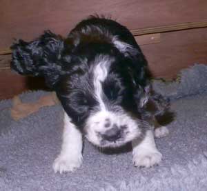 Sowenig wie sich das Wetter ändert, gibt es auch hier keine großen Veränderungen. Immer noch steht Besuch, Besuch auf dem Plan. (Besuch auch diesmal wieder mit guter Kamera, sodass Herr Höfling eine dritte C-chen Galerie eröffnet hat :-) Sobald es eben geht wird die Meute im Garten gefüttert, damit die unweigerlich folgenden großen Geschäfte bereits da erledigt werden, wo es auch später geschehen soll. Die Babies kennen jetzt den Weg vom Eingang der Welpensuite zum trockenen Futterplatz auf dem Rasen. Jedoch machen sie bei der Wetterlage keine großen Anstalten sich ausgiebig umzusehen sondern drängen schnell nach der Mahlzeit wieder in Richtung Welpenhaus wo das Handtuch zum Abrubbeln auf sie wartet. Die Vereinzelungen der Welpen Nr 3,4 und 5 haben auch keine völlig neuen Erkenntnisse gebracht: Rüde 4 war ähnlich beeindruckt von der neuen Situation und zeigte das gleiche Bild wie am Tag zuvor Rüde Nr6. Rüde 3 sah sich in Ruhe im ganzen Raum um, freute sich als er mich gefunden hatte und war recht guter Dinge, ebenso Hündin5. Gestern sind die Welpen zum ersten Mal einzeln auf den Trimmtisch gekommen, wurden sehr freundlich aufgefordert sich im Stand betasten zu lassen und sich dort oben wohl zu fühlen. Bald können die C-chen dann dort auch die Erfahrung mit dem Spanielkamm machen, obwohl es noch nicht viel zu kämmen gibt an meinen Kurzhaar-C-chen. :-) |