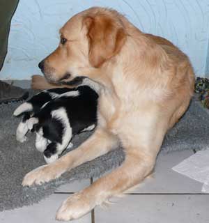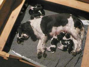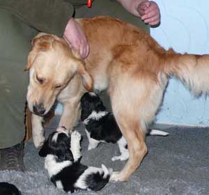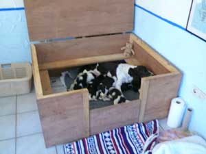 Die C-chen sind noch nicht einmal 48 Stunden alt und bestimmen schon den gesamten Tagesablauf. Sie benehmen sich altersgemäß, d.h. saugen und schlafen und saugen und schlafen. Das Saugen beherrschen sie so gut, dass ich heute schon auf der Waage bei allen eine Gewichtszunahme verzeichnen konnte- es ist doch immer sehr beruhigend das allabendliche Wiegen, dabei merkt man in den ersten Tagen die meisten Veränderungen. Ansonsten waren die ersten beiden Tage ausgefüllt mit Telefonaten, Post (vielen Dank für die vielen lieben Gratulations-e-mails!), jeder Menge zu waschender Wäsche, dem Umsorgen von Mama Joy und natürlich auch dem Rest des Rudels. Joy bekommt derzeit vier große Mahlzeiten am Tag und dementsprechend häufig muß ich sie auch entgegen ihrer natürlichen Lagerbindung aus der Wurfkiste komplimentieren damit sie draussen ihre nötigen Geschäfte verrichtet- erinnerte ich sie nicht daran, würde sie das wohl gerne vergessen. |