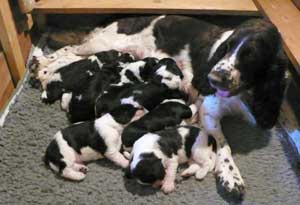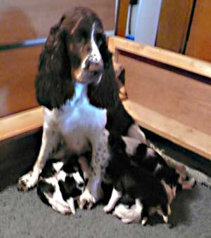 Der Zeitpunkt zum "Countdown" ist jetzt gekommen. Ich werde natürlich immer unruhiger während Joy immer ruhiger wird- so gleichen sich unsere Gemüter aus. Die Wurfkiste steht auch bereits neben dem Bett und Joy nutzt die darinliegende Welpenwäsche zum Scharren-üben (nicht, dass sie das nicht zur Perfektion beherrscht) Das Training fürs Scharren begann heute morgen um sechs und beendete meinen Nachtschlaf. Naja, im Bett ist es zur Zeit sowieso zu eng mit (geschätzten) 8 Springern und zwei Zweibeinern :-) Irgendwie scheint bei dieser Trächtigkeit alles schneller zu gehen als beim B-Wurf: Joy hält bereits Milch vor für die Ankunft der Babies und ich neige dazu mir einige Tage früher frei zu nehmen. Vielleicht ist da aber auch nur der Wunsch Vater des Gedanken, und Joy wird genauso pünktlich sein, wie vor zwei Jahren. Lassen wir uns überraschen! Wetten werde ich in der Beziehung jedenfalls nicht mehr... :-) |