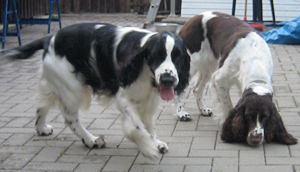 Da ja eine Hündin nicht vom ersten bis zum letzten Tag der Läufigkeit deckbereit ist und empfangen kann, sondern nur rund um die Tage des Eisprungs herum, ist es immer eine kitzelige Angelegenheit den richtigen Zeitpunkt für den Deckakt zu finden. Bei der Bestimmung des Zeitpunktes kann der Tierarzt helfen mit regelmässigen Abstrichen während der Läufigkeit. Bisher habe ich diese Dienstleistung noch nicht in Anspruch genommen, halte sie aber für eine gute Sache bei weiten Reisen mit begrenztem Aufenthalt beim Deckrüden. Hilfreich für mich ist mein "Läufigkeitstagebuch" wo ich von jeder Hündin Beginn, Ende und Verhalten während der Hitze notiere. Rund um den richtigen Tag fordern die Hündinnen zu wilden Spielen auf und es geht sehr unruhig zu, auch im Haus. Spiele im Haus sind bei uns eigentlich streng verboten, zu diesem Zeitpunkt lassen sie sich aber nicht mehr unterbinden. Der 31. Juli als Tag X war offensichtlich richtig bestimmt, denn wir hatten nach einer längeren Kennenlernphase und Geduld, Geduld den ersten hoffentlich erfolgreichen Decktag von Joy und Barnie. Um die Chancen zu erhöhen, dass die Hündin auch tatsächlich aufnimmt, ist es üblich eine zweite Paarung innerhalb von 48 Stunden zu arrangieren. Also machten Joy und ich uns am Donnerstag noch einmal auf den Weg zu ihrem Auserwählten, ausgestattet auch mit allerlei Papierkram und einer Flasche Sekt. Diesmal dauerte es nicht lange, das Eis war gebrochen und wir konnten uns in aller Ruhe zurücklehnen, einen Sekt auf die Vermählung trinken und den Deckschein ausfüllen. Erfreulicherweise war an diesem Tag auch das Ergebnis von Barnies Fucosidosetest eingetroffen, sodass alle erforderlichen Papiere schon bereitliegen für den Versand ans Zuchtbuchamt. Mit großer Spannung werde ich in den nächsten Wochen Joy beobachten und hoffen, dass alles nach Wunsch verläuft. Wenn es geklappt hat erwarten wir die Welpen rund um den 2. Oktober.