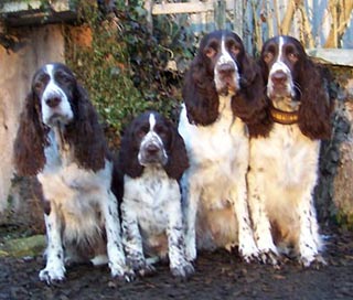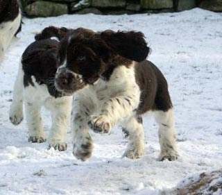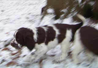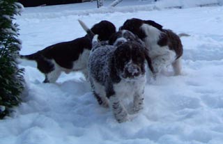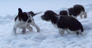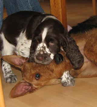16.01.09 nicht viele Worte Neben Pearls Geschichten hier gibt es auch von den restlichen E-spañas noch einiges zu berichten. Poldy war schon mit im Revier und hat an etlichen Fährten ausgiebigst geschnuppert er läuft natürlich prima ohne Leine mit, etwas schwierig ist nur die Knabberei der spitzen Welpenzähnchen. Genau davon weiß auch Oskars Familie ihr Leid zu klagen- die tollen fünf Minuten wachsen sich auch schon mal aus und brauchen dringend strikte Grenzen. Ansonsten läuft auch hier das Zusammenleben gut, die Nächte sind ruhig und die Geschäfte werden bevorzugt im Garten erledigt. Was das "Puppybiting" angeht ersticke ich bei Pearl die Ansätze im Keim und sie kann ihre tollen fünf Minuten an Undis ausleben- da haben dann beide Spaß. Klein Amber habe ich ja nun schon zum dritten Mal gesehen- sie entwickelt sich prächtig, fühlt sich wohl im neuen Rudel und ist dort genau richtig -ihre Grenzen zeigen ihr eine hundeerfahrene Familie und die beiden Rudelchefinnen Jeanny und Tallulahbelle. Die versprochenen Videos von Pearls "Training" sind online: -Die Sache mit dem Napf 15.01.09 "Sitz+Bleib- pas de probleme" Ich bin immer wieder erstaunt wie viele Dinge Welpen im Rudel problemlos lernen einfach durch "ich mach´s genauso wie die Großen". Ich finde das Sporties-4-Generationen-Foto rechts, einfach das beste Beispiel für die Tatsache des Lernens am Modell. Viel wird mir also an Erziehungsarbeit von meinen Mädels abgenommen, aber weil es mir (und Pearl auch) soviel Spaß macht, lernt Pearl auch über die Alltagsstrukturen hinaus viele wichtige und unwichtige Dinge. Sie ist sehr clever und lernt schnell. z.B. aber vielleicht ist das auch genetisch von Fine weitergegeben das Apportieren des Futternapfs. :-) Heute nach der Morgenfütterung habe ich gesehen wie sie einen der Alunäpfe meiner Mädels in ihr Körbchen geschleppt hat. Das angebotenen Verhalten mußte ich dann heute Abend einfach nutzen und sehen, ob wir das nicht auch im Laufe der Zeit in geregelte Bahnen lenken können- wäre ja nett wenn jemand hinter den Mädels herräumt und dieser jemand bin mal nicht ich. ;-) . Morgen im Laufe des Tages gibt es dann ein Beweisvideo- es wartet darauf bei Youtube hochgeladen zu werden. Genauso wie noch einige andere Beweisvideos für "clever little girl"- Heute habe ich einfach mal unsere abendlichen Clickersessions gefilmt- lustig! Was sonst noch geschah in den letzten zwei Tagen. Pearl wird Begleithund: am Dienstag begleitete sie mich zur erweiterten Vorstandssitzung der Flotten Pfoten Soest e.V., um im Restaurant gemeinsam mit Schwesterchen Amber unter dem Tisch zu schlummern- Allerdings erst nachdem sie die Tasche von Ambers Frauchen auf links gedreht hatte. Gestern Abend begleitet sie mich zum Obediencetraining in der Reithalle- Uuuuui was war da viel los- und soooo viele kläffende Hunde- oooh und Warten in der Box gemeinsam mit Undis. Fremde Hunde hat Pearl dort nicht kennengelernt aus der Ferne angesehen schon, aber Kontaktaufnahme am "Arbeitsplatz" ist ein Verhalten, dass ich nicht bestärken will. Ich konzentriere sie also in solchen Situationen ganz auf mich und wir beide treiben lustige Spiele miteinander. 12.01.09 Terrier-Overflow :-) Zweieinhalb Tage ist Pearl jetzt schon Rudelmitglied und wir arrangieren uns super. Der tägliche Ablauf mit Fütterungen der Grossen und der Kleinen, Spaziergängen (Pearl begleitet uns jetzt im Rucksack auf meinen Bauch geschnallt und darf zwischendurch kurze Strecken mitwackeln), wer schläft wo und auch wie lange, und die Sache mit dem Pipi im Haus scheinen bereits geklärt. Bonnie die ansonsten mit Welpen erst nach dem Zahnwechsel gnädig verkehrt kommt auch mit Pearl zurecht, allerdings habe ich sie beide immer im Blick- Vorsicht ist besser als Nachsicht und ich mag die alte Lady nicht unnötig stressen. Die meiste Zeit versucht Pearl gar nicht die alte Dame zu kontakten mit der wohl nicht gut Kirschen essen ist- nur manchmal im Übermut des Spielens streift sie auch Bonnie um die Schnauze und dann muß ich eingreifen. Das reicht dann allerdings auch wieder bis zur nächsten exzessiven Spielphase. Gestern haben wir Welpensuite und Wohnung wieder in den Urzustand versetzt: Umzugsunternehmen Sporties&Co lässt grüßen. Dann haben wir uns auf den Weg nach Ahlen gemacht zunächst ein kurzes Training mit Undis und herumhoppeln auf dem tiefverschneiten Hundeplatz für Pearl danach ein Besuch bei den Camster Cairn`s - oh je arme Pearl, in der "Wurfstube" tummelten sich unzählbare 12 Terrier (davon ein Rieeeesen Airedaleterrier, ein Sheltie, der Camster Cairn´s O-Wurf und fünf Zweibeiner. Ganz ihrem Naturell entsprechend war Pearl zunächst zurückhaltend, sass unter meinem Stuhl und schaute sich das bunte Treiben in Ruhe an. Als dann klar war, wie welcher Hund einzuschätzen ist, von wem man sich lieber fern hält und wer schöne Spielaufforderungen macht, taute sie auf und erlag Pebbles Charme. Ein nettes Spiel mit dem jungen Airedaleterrier bahnte sich an und später steckte Pearl auch ihre Nase an das Gitter des Welpenauslaufs, um sich diese Mini-mini-mini-Ausgaben von Hund einmal anzusehen. Es dauerte nicht lange und dann schlief sie unter meinem Stuhl zusammengerollt in diesem Trubel ein. Am heutigen Tag blieb Pearl mit Joy und Undis in Küche und Schlafzimmer während ich zur Arbeit war. Wieder wurde ihr das Mittagessen von meinen Eltern gereicht und ich war ganz gespannt wieviele Pipiseen und/oder Häufchen ich bei meiner Rückkehr wohl finden würde- Nichts! Gar nichts. Nachmittags machten wir uns wieder auf auf unseren Spaziergang das erste Stück mit Pearl an der Leine geführt am Geschirr- das LeinenMakramee von vier Hunden plus Welpe war auch nicht viel schlimmer als sonst ;-) aber es ist schon schön wenn´s endlich heißt "Leinen los". Am Abend machen wir jetzt vor dem Abendessen unsere "Clickersessions" im Wohnzimmer. Pearl hat schon den Bogen ´raus- nach der anfänglichen Konditionierung der letzten Tage bot sie 