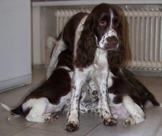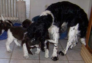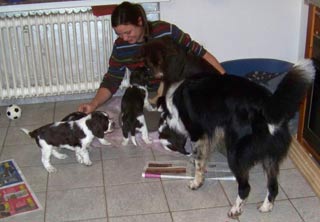 11.11.08 (63. Tag) 11.30 Uhr Finchens Temperatur ist jetzt auf dem bisherigen absoluten Tiefstwert von 37,1 Grad. Folgende Messungen werden zeigen ob die Temperatur weiter fällt oder ob es sich wieder nur um eine der größeren Schwankungen der letzten Tage handelt. Leichtes Muskelzittern war erstmalig zu beobachten und der Flamenco der E-spañas ist mittlerweile auch nicht nur zu fühlen sondern schon zu sehen. Ich würde mich freuen wenn es jetzt so langsam losginge, das Warten ist ganz schön zermürbend. Das erste Decken ist jetzt auf den Tag genau 9 Wochen her und der S-Wurf de los tres Robles ist genau neun Wochen alt. Auf den Fotos rechts kommt Humphrey der Vater der bei uns sehnlich erwarteten E-spañas seinen Sozialisierungspflichten nach. Es ist einfach nett wie er mit dem 10er Prachtwurf umgeht -es sind ja gar nicht seine Welpen aber das kümmert ihn nicht. Rudelnachwuchs gehört erzogen :-)