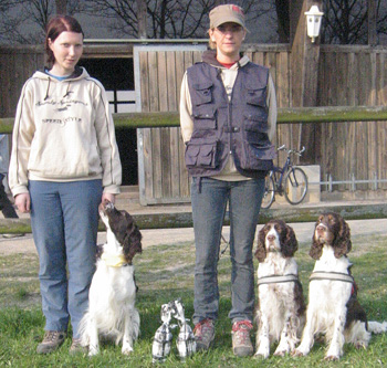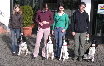 Am vergangenen Wochenende fand unser erstes Obedienceseminar 2007 beim HSV Münster statt. Drei Generationen Springer Spaniel unterstützen mich und Ines Hofeditz in unserer Arbeit den schrittweisen Übungsaufbau zu verdeutlichen. SS Black Gwynniver mit ihren jugendlichen 14 Monaten machte diesen Job zum ersten Mal, aber nicht weniger enthusiastisch als ihre Oma Nova und ihr Onkel SS Anubis. Joy und Undis mussten leider wegen Läufigkeit zu Hause bleiben und kommen so erst beim nächsten Seminar mit zum Einsatz. Das Seminar ist bei den 20 Teilnehmern (Teams der Prüfungsstufen Beginner bis 0III) aus verschiedenen Vereinen sehr gut angekommen, und so wird unser Terminkalender immer mehr gefüllt. |