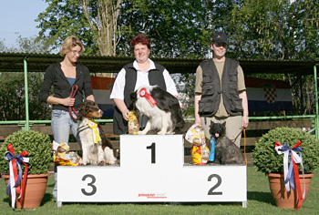 06.05.2007 Die Saison hat begonnen Während unser B-Wurf noch die Freuden des Teenageralters geniesst (rechts SS Busy Bee "Abby") geht es für unsere "Erwachsenen" wieder um Punkte, Ergebnisse und Qualifikationen. Desperados Undis erreichte gestern auf der Europasiegerzuchtschau ein V4 in der Zwischenklasse Hündinnen unter dem Richter Walter Schicker. Abby hat uns dort bei der Schau besucht und auch gleich die Augenuntersuchung hinter sich gebracht, sie ist vorläufig PRA/Kat frei. Am Freitag waren vier Sporty Springers und ein Desperadoer zur Speichelprobenentnahme für den PRA-Gentest. Wir erwarten die Ergebnisse mit Spannung aber ohne falsche Hoffnungen. Am vergangenen Sonntag unterstützten wir den AG-Tag der anderen Spanielrassen mit Vorführungen aus unseren Sportbereichen. Joy, Undis, Hope und Finwe bewiesen dem Publikum wie viel Spaß ein Springer an der Arbeit mit seinem Menschen hat. Der AG-Tag war hervorragend organisiert von Pamela Markewitz, Heike Heidenblut und Rolf Hintzen und vor allem für die Kinder wurden viele Aktionen geboten. Ein großer Spaß war der Juniorhandling Workshop mit anschließendem Wettbewerb bei dem Marie Nolting mit Abby einen zweiten Platz in ihrer Altersklasse belegte. Mir persönlich hat vor allem die Dummyvorführung von Frau Wojahn-Willascheck und ihrem Field Trial English Springer Spaniel gefallen. Dem Organisatoren-Team ein herzliches Dankeschön! Am Tag davor waren wir mit Sack und Pack bei der Obedienceprüfung in Weeze. Mit 75 Startern in allen vier Leistungsstufen kann man eher von einer Obedienceparty sprechen. Anubis belegte einen vierten Platz in einem mit 12 Startern hervorragend besetzten OIIIer Starterfeld. Über meine Ergebnisse mit Joy hülle ich den Mantel des Schweigens und lege das Erlebte ab in der Schublade "weibliche Wehwechen". Wer mag kann die Punkte der Obediencerangliste entnehmen. Als abschliessendes "Schmankerl" und als Entschuldigung dafür, dass ich aufgrund der Walpurgisnachtfeierei nicht ganz "up-to-date" war, habe ich noch eine Seite mit Fotos von SS Anubis bei der EM-Qualifikation anzubieten. Vielen Dank, Melanie Licciardi (Lifestyle Aussies) für die schönen Bilder!