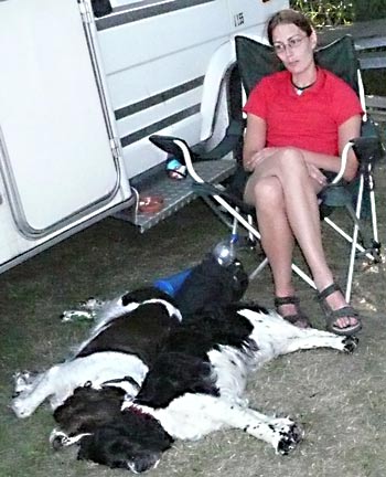 Happy Go Lucky, Obedience BSP 09 aus meiner Sicht Donnerstag: Irgendwann, mitten in der Nacht, kamen wir auf dem Gelände des HSV Groß Grönau an. Für mich nach einem normalen Arbeitstag, jeder Menge, Organisation, Packen und 7 Stunden Wohnmobillenken. Gott sei Dank war trotz nächtlicher Stunde unsere Vereinskollegin Gaby noch wach, und half bei der Stromversorgung im Dunkeln. Undis und Joy waren im Wohnmobil sofort wieder heimisch, kein Wunder ist unsere Schwedentour doch erst knapp vier Wochen her gewesen. Freitag: In weiser Voraussicht hatte ich natürlich meinen Wasserkocher und löslichen Kaffee eingepackt denn ich kann ja wirklich nicht erwarten, dass vom ausrichtenden Verein die Küchenhelfer schon zu meiner inneren Uhr ticken und den Morgenkaffee um fünf Uhr bereithalten. ;-) Eine halbe Stunde konnte ich die Morgenstille geniessen, dann waren auch die Nachbarn wach und es gab ein erstes nettes Pläuschchen. Nachdem sich einige Zeit später auch Ines aus dem Alkoven geschält hatte ging es ans "Mobileinzäunen". Gerade stand der Zaun und wir packten den Pavillion als Schattenspender aus um ihn aufzubauen kam es zur ersten Schwierigkeit- Wohnmobil einen Meter zu weit links geparkt- da müssen ja auch noch andere hin. Na, gut des Vorsitzenden Wille ist sein Himmelreich, Zaun wieder abbauen 30cm weiter rechts eingeparkt, den Nachbarn den Pavillion unters Vorzelt geschoben- herrlich diese Nähe. Aber was soll´s ist schließlich umsonst und Urlaub. Der Vormittag stand zur freien Verfügung und ich nutzte ihn zum "endlich alleinsein" denn mein Trüppchen brach auf zum Ratzeburger See und noch schnell was Einkaufen. Unsere Gaby war das ganze Wochenende eine unbezahlbare Hilfe, war sie ja im letzten Jahr sowohl auf der BSP als auch auf der DM gewesen hatte sie eine ungefähre Idee vom Ablauf und passte auf wie ein Schießhund um ja die angesetzten Besprechungen als auch die Trainingszeit nicht zu verpassen. |
