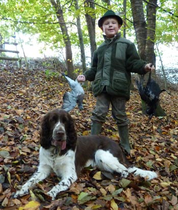 12.11.09 Fines Vierlinge werden ein Jahr alt Die E-spañas haben heute Geburtstag. Heute vor einem Jahr sind Poldi (SS Empollón), Oskar (SS Elogio), Amber (SS Energía) und Mocca (SS Elegida) zur Welt gekommen- Kinder wie die Zeit vergeht. Zum Ehrentag der vier grüßen Poldi und "Junior-Herrchen" Maximilian vom Foto rechts. Das Federvieh in des Waidmännchens Hand hatte Poldi kurz zuvor nach dem Schuß apportiert. Jetzt drücken wir die Daumen fürs HD-röntgen und erwarten die Ergebnisse mit Spannung. |
