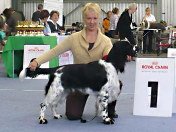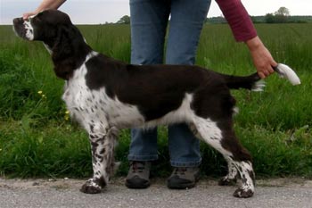 22.06.09 Spezialrassehundeausstellung Neuss- immer wieder schön SS Coffee 'N Cream hatte ihr Debut im Schauring wurde von Frauchen Heike Diron sehr liebevoll vorgeführt und erhielt ein SG2 in der Zwischenklasse. SS Energía trat zum zweiten Mal in der Jüngstenklasse an, erhielt ein versprechend 1 von 2 vorgestellten Hunden. Ihr Frauchen Natalie hat, was das Handling betrifft, deutliche Fortschritte gemacht: Amber zeigte sich temperamentvoll in der Bewegung und schon routiniert im Stand. Auch mein "schwarzes Schaf" Desperados Undis erhielt ein SG2 in der offenen Klasse. Gemeinsam mit SS Elogio der als Zaungast angereist war, hatten wir einen schönen Tag auf einer liebevoll organisierten Schau deren Gelände und Umfeld (direkt am Rhein) für unsere Springer ideal ist- für mich ist klar: Neuss muß sein :-) |