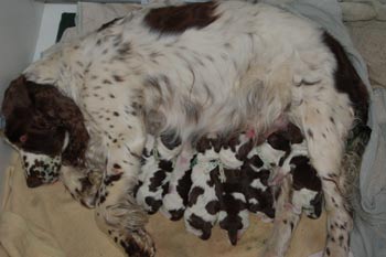 12.06.2011 Glückwunsch ins Wochenbett Heute Morgen brachte Alanna vom Schieferberg acht stramme Welpen zur Welt, Kinder von SS Firefox. Die Färbung der Welpen ist braun/weiß und braun/weiß mit Loh. Pommes gratuliert seiner Alanna ganz herzlich zu dem schönen C-Wurf im Kennel vom Schieferberg.