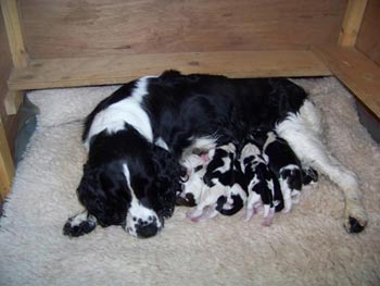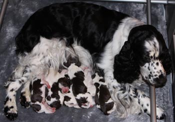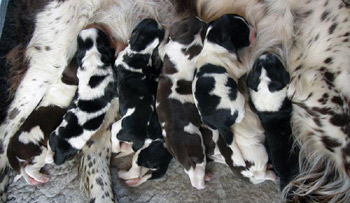 20.10.2011 Die Geburt der ersten E-spaña-Enkel! Am Abend des 19.10. begann SS Elegida (Mocca) in Dänemark im Kennel Happy Leans mit der Geburt ihres ersten Wurfes. Es stellen sich nun 9 dänische Zwerge vor: es sind 6 Mädchen (4 schwarz-weiß) und drei Jungs (1 schwarz-weiß). Wir freuen uns mit der Züchterin Anne Hosbond über die völlig instinktsichere Mocca, die das Geschehen in der Wurfkiste hervorragend gemanagt hat. Vater der Welpen ist NORD UCH SEVCH Astrospring´s Monoceros (Bubblan). Zwei der Mädchen und ein Rüde sind noch nicht versprochen.