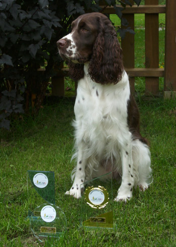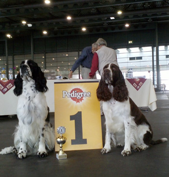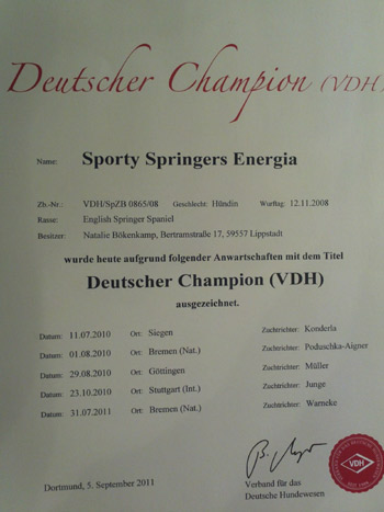 01.08.2011 ein frischgebackener Deutscher Champion und ein BOB Zu meiner grossen Freude durfte ich dabei sein als SS Energía das letzte VDH CAC für den Titel deutscher Champion VDH bekam. Sie gewann gestern bei der Nationalen Rassehundeausstellung in Bremen die offene Klasse Hündinnen mit V1 und eben dem passenden CAC, ein Jahr nach dem Erreichen des ersten CAC. Ich bin sehr stolz auf meinen ersten Sporty Springers Champion :-) Herzlichen Glückwunsch an Ambers Besitzerin Natalie Bökenkamp! Mein Cinco heimste sein drittes VDH CAC ein, bekam auch das Klub CAC, wurde bester Rüde und Rassebester. Am Samstag bei der Internationalen sah das Ganze ein wenig anders aus. Hier bekam Cinco V2 mit Res VDH CAC, Amber Sg1 der Lichtblick am Samstag war die Firefox Tochter Felicitous Africa die ein vv1 in der Jüngstenklasse erhielt. nachträglicher Geburtstagsgruß und schon wieder kann ich nur noch nachträglich gratulieren. Am 30.07. hatten die F-röschchen ihren zweiten Geburtstag. Lotta, Emma, Flake, Fire, Falk, Laurin, Jamie und Pommes alles Gute zum Wiegenfeste. Bleibt weiterhin gesund und macht euren Menschen weiter so viel Freude bei euren gemeinsamen Aktivitäten!