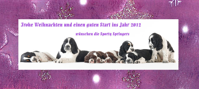 27.12.2011 Happy Birthday B-Wurf Heute vor sechs Jahren bekam Joy ihren ersten Wurf, den Sporty Springers B-Wurf. Sechs Jahre vergehen schnell im Züchterleben und so können wir jetzt den I-Wurf und damit "Enkel" vom B-Wurf bewundern. Ich wünsche Barani, Matisse, Scotty, Ronja, Fine, Gwynn, Abby und Loulou alles Gute zum Geburtstag und ein weiteres schönes Lebensjahr. Vielen Dank... ...für all die lieben Weihnachtsgaben, Karten und Grüße. Leider bin ich in diesem Jahr erstmalig nicht dazu gekommen Post auf die Reise zu bringen. Ich hoffe ihr seht es mir nach. Auch der Jahresrückblick muß bei der ganzen Welpenwonne hintenanstehen. |