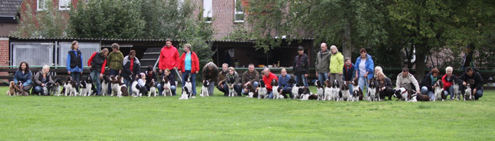Das Sporty Springers, Felicitous & Friends Festival hat stattgefunden mit einer Rekordteilnehmerzahl von 41 English Springer Spaniel, 5 English Cocker Spaniel und zusätzlich 4 Hunden anderer Rassen nebst ihrem zweibeinigen Anhang, den wir zu zählen vergessen haben. Wir Zuschauer kamen in den Genuss einer ausführlichen Vorführung der Rettungshundearbeit. Yvonne Finke (Vivo) , Dagmar Tschertner (Helo), Heike Diron (Penny) und Wolfgang Krüper (Käthe) zeigten uns den Aufbau und die fertige Flächensuche sowie einen einfachen und einen anspruchsvollen Trail für den Mantrailer. Yvonne erklärte dabei die Arbeit sehr ausführlich und gab einen gelungenen Einblick in diesen Arbeitsbereich des ESS. Susanne Menten vom Kennel Felicitous zeigte im Verlauf des Tages den höchst interessierten Zuschauern das korrekte Trimming des ESS. Eine weitere sehr unterhaltsame Vorführung zeigte uns Susanne Sontowski mit Eddie. Eddie hat im Trickdogging-Kurs jede Menge lustiger Tricks gelernt, die die Zuschauer mit Lachen und Beifall quittierten. Als Überraschung für mich schloß sich eine Vorführung von Birgit Funk (Laurin), Monika Morlak (Jamie), Elli Jansen (Google) und Steffi Strauch (Jule) an. Diese vier zeigten eine Obedience-Quadrille zu Musik. Eine Superidee die so niedlich anzusehen war! Den Abschluß des gelungenen Tages bildete wie immer das Hunderennen, das diesmal in 3 Altersklassen ausgetragen werden mußte. Bei den Babies (bis 4 Monate) siegte Fame, beim Jungvolk (bis 12 Monate) hatte Luca die Nase vorn und im grossen Teilnehmerfeld aller älteren ESS gewann Coffee. Zwischendurch war immer wieder die Gelegenheit alle teilnehmenden ESS im Freilauf zu bewundern und selbst die pubertierenden Jungs verhielten sich nahezu mustergültig. :-) Für uns Zweibeiner war es ein gelungener Tag mit tollen "Hündelergesprächen", kurzweiligen Vorführungen und nicht zu vergessen mit hervorragendem Salat und Kuchenbuffet zu dem jeder Teilnehmer etwas beisteuerte. Ein Dankeschön auch den zwei Damen vom Grill -Birgit und Gaby! Vielen vielen Dank allen Teilnehmern, dass ihr teilweise so weit angereist seid um entweder unsere Kinder einmal wieder zu zeigen, oder eben unsere Kinder einmal in Massen kennen zu lernen. Erste Fotos aus der Kamera von Susanne Menten gibt es in diesem Album HIER |