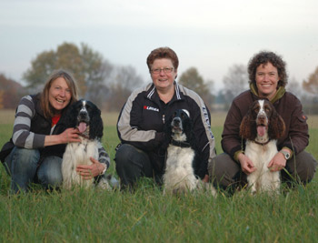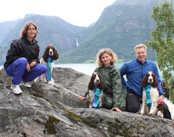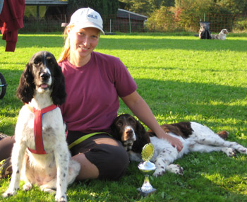 25.07.2011 Zurück aus dem Land der Trolle und Elche Ein unvergesslicher Urlaub liegt hinter uns. Ich habe von der ersten bis zur letzten Minute alle Eindrücke aufgesaugt. Die 14 Tage waren voller Aktivitäten und obwohl es uns nicht gelang Elche und Trolle fotografisch festzuhalten sind doch ein paar schöne Bilder entstanden. Diese und ein ausführlicher Urlaubsbericht folgen. Jetzt auf die Schnelle nur die Zusammenfassung der Ergebnisse der Sporties der letzten 14 Tage. SS Agility Jump For Joy legte am 15.07.11 in Gaupne eine norwegische Jaktanlegsprøve (Kaninchenschleppe, Wasserapport einer Ente (mit Schuß), 15 Minuten Buschieren) ab. Joy und mir hat das Riesenspaß gemacht obwohl ich mich wie ein Greenhorn fühlte ;-). Drei von vier teilnehmenden Hunden bestanden die Prüfung. (Foto oben) SS Coffee N Cream erarbeitete sich ungeachtet der urlaubsbedingten Nachrichtensperre mal eben innerhalb von 7 Tagen den Aufstieg in die A3. Nach der letzten Quali Anfang Juli siegten Coffee und Heinz sowohl am 17.07. als auch am 24.07. in der A2. Coffee ist also der vierte Sportie der nun in der Königsklasse A3 starten darf. Die Ne-G-erlein hatten Geburtstag am 17.07. Wir gratulieren nachträglich ganz besonders herzlich zum einjährigen Wiegenfeste: Lovis, Finja, Google, Käthe, Helo, Vivo, Eddie, Filou, Joker und Cooper macht bitte euren Menschen weiterhin viel Freude und bleibt quietschfidel und munter! Die ersten G-Zwerge sind bereits geröngt und es heißt jetzt nägelkauend warten auf die offiziellen HD- Ergebnisse. SS Fraser war am 21.07. zur DOK Augenuntersuchung inklusive Gonioskopie und ist bis auf eine Distichie (Wimper innerhalb des Auges) befundfrei. Whimsical de los Tres Robles (Cinco) erhielt bei der SRA Norderstedt am 24.07. in der Zwischenklasse das V1 mit VDH CAC. Gerichtet hat dort Bertil Lundgren aus Schweden. Desperados Undis (Foto unten mit Tochter SS Dear Divony und Enkeltochter Cathy Just For Fun) gewann bei der o.g. SRA Norderstedt die offene Klasse Hündinnen mit VDH CAC, wurde beste Hündin mit Klub CAC und im Anschluß Best of Breed. 17 Springer Spaniels waren gemeldet, davon 4 deutsche Champions. Wir haben in unserem tollen Urlaub viele alte Freunde wiedergetroffen und neue Freunde dazugewonnen. Ich danke Inger Handegård und Sjur Haugen sowie dem Luster Hundeklub und dem norwegischen Spanielklub Abteilung Sogn og Fjordane und Tina & Hannes Hagge und der JSpK LG Nordmark für ihre Gastfreundschaft.