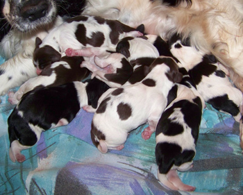 10.09.2013 K-lapperstorch bringt K-rümelchen Der Erstgeborene des K-Wurfes hat sich beeilt so dass das Geburtstdatum der Zwerge der 9.9.13 ist. Wir freuen uns über 6 Rüden und 2 Hündinnen in den Farben schwarz-weiß (ein Rüde eventuell mit Loh). Die Gewichte sind ordentlich von 288g bis 444 g.Die K-rümel wurden vom Klapperstorch geliefert in der Zeit von 23.40 Uhr bis 08.15 Uhr. Nun ist hier erstmal Ruhezeit angesagt, und ein Tagebucheintrag muß aufgrund von ausgeprägtem Schlafmangel wohl bis Morgen warten. |