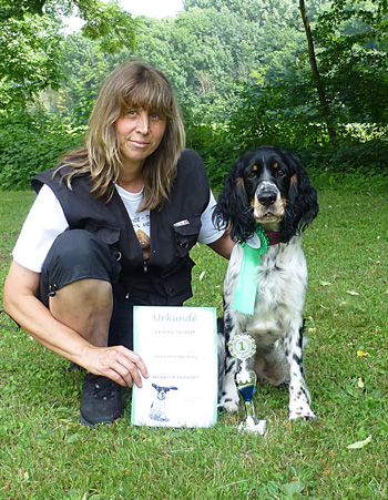 15.09.2013 Tilda und die Jägermeister SS In Sunrays (Tilda) hat gestern die Brauchbarkeitsprüfung gem § 6 BPO NRW, d.h. jagdlich brauchbar für die Nachsuche auf Niederwild (außer Rehwild) bestanden. Veranstalter der Prüfung war die Kreisjägerschaft Ennepe-Ruhr. Dies war eines von mehreren Etappenzielen ihrer Besitzerin Stefanie Gayk. Ich bin sehr froh, dass Stefanie und Tilda sich gefunden haben, denn Stefanie ist eine sehr geduldige und vielseitig interessierte Hundeführerin. Tilda ist keine zwei Jahre alt und hat jetzt bereits den Jugend Championtitel, ist geprüfter Begleithund, hat die Zuchtzulassung und nun auch noch die jagdliche Brauchbarkeit bescheinigt bekommen. Im nächsten Jahr ist ein Wurf geplant mit Tilda in Stefanie Gayks Zuchtstätte. Ich bin sehr gespannt. Das Foto rechts von Tilda stammt aus der Kamera von Sabine Otto. Die Jugend von Gestern... ...ist heute bereits in der Zwischenklasse. Meine J-ust-Do-Its sind heute auf den Tag genau 18 Monate alt und so wurde SS Just Do It (Nike) heute bei der SRA Neukirchen in der Zwischenklasse gezeigt. Sie erhielt das V1 mit VDH CAC vom Zuchtrichter Herrn Dr Kettendörfer. |