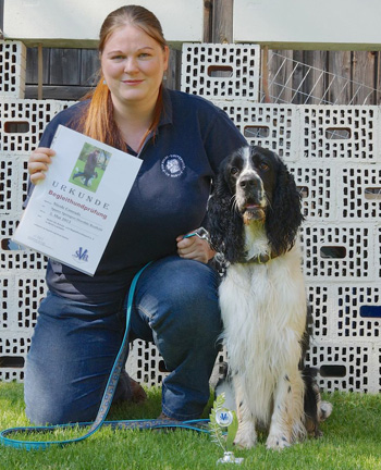 Samstag Nina Kerkhof und ihre Sunny (SS In Sunshine) sind nun geprüftes Therapie- und Pädagogik-Assistenzhundeteam. Nina legte am Samstag die schriftliche Prüfung in der Fachklinik in Bad Pyrmont ab und Sunny war bereits am Samstag zuvor zur praktischen Prüfung im Einsatz. Nina ist zurecht stolz auf ihre Sunny die bereits mit 15 Monaten so ausgeglichen und versiert ist in der Klasse eine grosse Hilfe zu sein. 15 Monate ist das Mindestalter zur Prüfung. Elisabeth Schilling und Birk (SS Hold On) legten am Samstag die Rettungshundeprüfung mit Bravour beim DRK ab. Bestnoten bescheinigen Birk eine sehr schöne Leistung. Auch Birk st mit seinen 22 Monaten noch grün hinter den Ohren für so eine hochwertige Prüfung. Herzlichen Glückwunsch allen Hundeführern die an diesem Wochenede aktiv waren! |