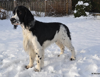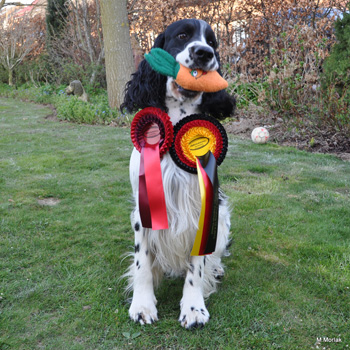 13.09.2015 Premiere Der Kennel Sporty Springers hat mit SS Katnis (Katja- Foto) seinen allerersten Viltspor Champion (Schweißfährten Champion in Norwegen- NVCH). Katja ist gerade erst zwei Jahre jung und hat am Samstag den Titel errungen. Ihr Besitzer Helge Growe ist erfahrener Hundeausbilder diverser Rassen, nun schwört er auf Springer Spaniels. Abstinenzler Ebenfalls am Samstag startete ein Team im Obedience von dem wir schon lange nichts mehr hörten: Monika Morlak und SS Fraser (Jamie). Sie erliefen sich 226,5 Punkte SG in der Königsklasse OIII bei der HSG Kaarst unter LR Sabine Richarz. Dafür sprang der zweite Platz von sieben Startern heraus! Unvergessen Der Geburtstag des K-Wurfes am 9.9. wurde nicht vergessen sondern verhindert ;-) Alles Gute nachträglich an Katja, Kamie, Kayo, Silas, Kayden, Django, Miles und Kiro. N-iños in Planung Als bestes Mittel gegen die Winterdepression planen wir den N-Wurf. :-) Infos HIER.