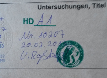 23.02.2017 Grund zur Freude Jede Menge gute Neuigkeiten gab es in den letzten Tagen. Eine davon ist Skadi´s HD-Ergebnis. Obwohl sie in der Aufzuchtphase eine kleine Pummelfee war und auch schon früh die Treppen laufen mußte, weil ich nicht fit genug war sie zu tragen, bringt uns das offizielle Resultat der Röntgenauswertung eine A1-Hüfte. |