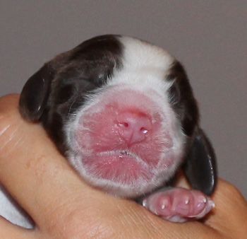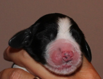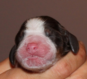 Sechs Minuten später begann die nächste Reihe Presswehen- kaum Zeit zu verschnaufen. 19 Presswehen später kam eine gut gefüllte Fruchtblase, der Inhalt wieder als Steißgeburt. Um 20.56 Uhr wurde also unser zweites Mädchen geboren eine Hündin in schwarz-weiß mit Lohfärbung. 312 g wog sie, und war drei Minuten nach der Austreibung bereits ins Saugen versunken. Keine fünf Minuten nachdem diese Maus versorgt war, fing Fame erneut an zu pressen. Man kam als Helfer kaum zur Ruhe. Um 21.09 Uhr landete ein weiteres Mädchen im Lager, sie kam eingepackt und zeigte uns zunächst ihr Schwänzchen. Nach dem Auspacken und Abnabeln zeigte die Waage 370 g an.