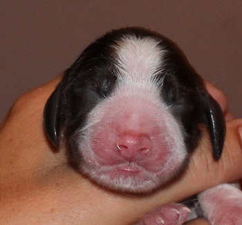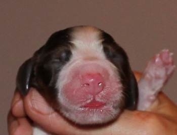 Mehr als eine Stunde lang mußten wir warten auf den ersten neuen Erdenbürger. Mir kam ein Näschen ohne Fruchthülle entgegen, aber Fruchthülle und Placenta brachte er am Nabel mit. Um 20.35 Uhr kam ein brauner Rüde bei uns an. Er wog 404 g, war quicklebendig und saugte bereits 5 Minuten später. Warum es bis zum Saugen so lange dauerte, erklärt die Ankunft seiner Schwester, genau eine Minute nach ihm um 20.36 Uhr, sie ist braun-weiß mit Loh gefärbt und kam mit der Rute zuerst bei uns an. Auch sie brachte ihre Nachgeburt mit, die Fame natürlich entsorgte. Das Mädel brachte 298 g auf die Waage und brauchte ebenfalls genau 5 Minuten bis zum ersten Saugen.