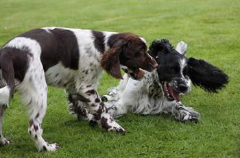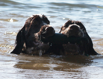 Nachdem hier nun sieben adrette Springer Haus und Hof bevölkern (Nummer acht war noch nicht so ganz schlimm unfrisiert) hatte ich diese Woche auch Zeit für die To-Do-Liste. Lara hat ihrer Tochter das Schwimmen beigebracht (siehe letztes heutiges Foto). Zu dem Zweck waren wir am Dienstag am Möhnesee- der auch zur Abendstunde noch völlig überfüllt war mit Badegästen. Lara hat das nicht gestört, zunächst schwamm sie ihre Bahnen, bis ich den Dummy auspackte. Skadi hielt sich zunächst an meinen Beinen fest und plantschte erstmal nur um mich herum, bis ich den Dummy auspackte. Der zog den Welpen derart magisch ins etwas tiefere Wasser, dass sie gar nicht gemerkt hat, dass sie geschwommen ist. Auf dem Rückweg hängte sie sich einfach mit an den Dummy, den natürlich Lara zuerst erwischt hatte, und nutzte das Ganze als Schwimmhilfe.