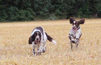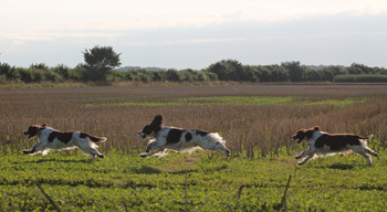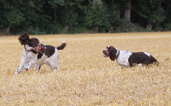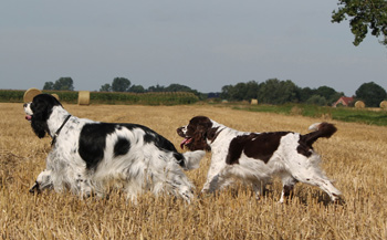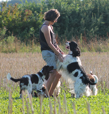 Trotz Vollsperrung auf der A2 sprang Aron nach Ankunft gut gelaunt aus dem Auto und ich war sofort begeistert von ihm, er ist ein überaus schicker Springerrüde in absolut passendem Format von hervorragender Qualität, ein wahrer Englisch Springer. Zunächst mußte jedoch Herrchen versorgt sein nach der langen stressigen Fahrt und zum Essen sperrte ich Fame noch einmal weg- Lara und Skadi waren eh längst aus der Schußlinie gebracht. Nach dem Essen liessen wir Fame wieder zu uns in die Küche, und es dauerte keine 5 Minuten und wir konnten Erfolg vermelden. Ein sehr zielstrebiger junger Bursche ist Aron, der auf eine Fame traf, die in der passenden Stimmung war. Ein zweiter Deckakt ist noch geplant, und danach wollen sich Aron und Morten auch schon wieder auf die Heimreise begeben. Damit sich die Fahrt über den eigentlichen Zweck hinaus gelohnt hat, haben wir heute in den frühen Morgenstunden noch ein paar schöne Fotos von Aron gemacht, die jetzt pö a pö ins Welpentagebuch einfliessen werden.