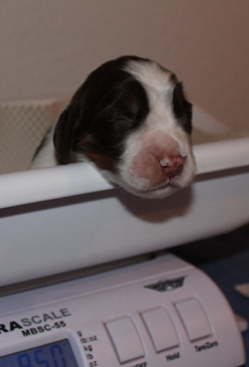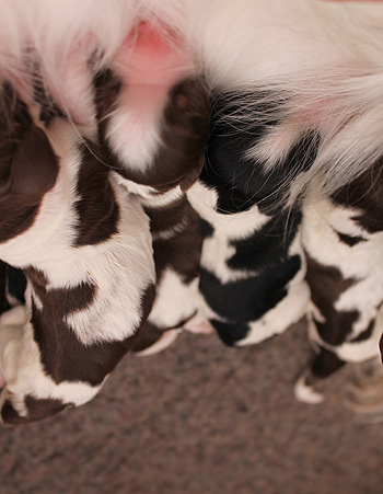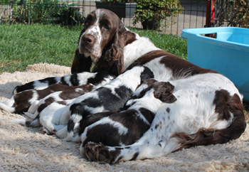 Die O-nneas bekommen jetzt drei Tagesmahlzeiten, und Fame bekommt auf ihre 6-fache Ration der anderen täglich noch eine halbe Fleischwurst. So wie sie, darf kein Springer aussehen, egal wie groß der Wurf ist den er versorgen muß.
