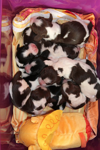Besuch, Besuch, Besuch, trimmen, trimmen, trimmen und was drumherum so anfällt, die Tage sind zu kurz. Ich kann nicht mehr nachhalten wie viele fremde Schuhe, Hände und Nasen die O-nneas jetzt kennengelernt haben, und noch ist kein Ende in Sicht. Einige zukünftige Springer-Eltern kommen auch mehrfach, andere erst wieder zur Abholung die noch sehr weit weg erscheint. Dazu kommen Zweibeiner die bereits zur Sportie-Familie gehören, und auch Leute, die aus dem Z-Wurf vorbestellen.