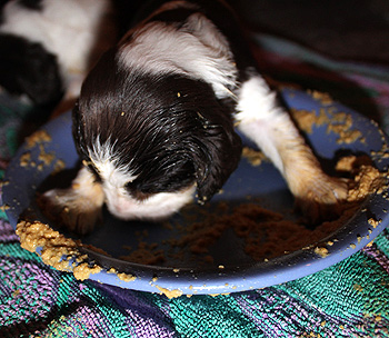 Bereits seit zwei Tagen bekommen die vier etwas leichteren Zwerge eine bzw zwei tägliche Mahlzeiten Welpenfutterbrei. Dies ist für mich ein Novum Zwerge schon am 16. Lebenstag zuzufüttern. Aber die Kleinen O-nneas sind dankbar und putzen ihre Schüssel seit dem ersten Versuch mit Genuß aus. Fame wartet dann geduldig, dass sie die Welpen nachher blanklecken kann.