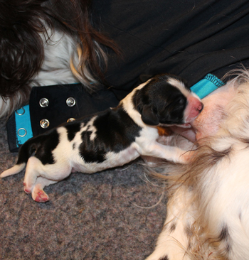 Zuhause angekommen war es höchste Zeit für Laras Hühnersuppe, sie hatte ja diesmal unter der Geburt keine Nachgeburten gefressen und hatte verständlicherweise einen Mordshunger. Die Kleinfamilie in der Wurfkiste fand sich schnell bestens zurecht.