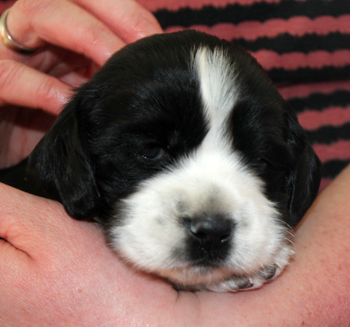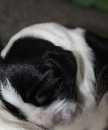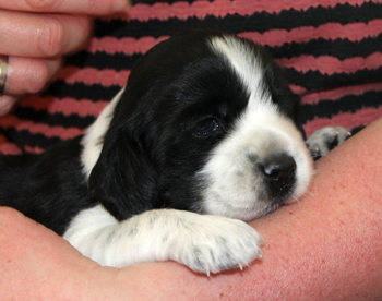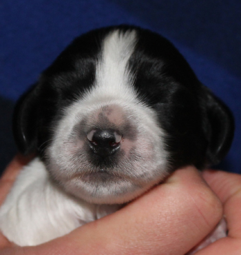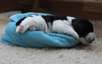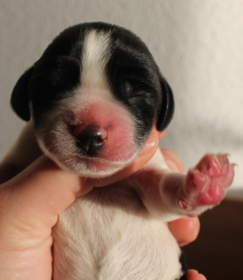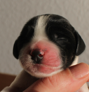 Am Mittwoch ging es los mit den Sorgen in Schlumpfhausen. Pitufo hatte am rechten Auge, das zu einem klitzekleinen Punkt geöffnet war, eine schlimme Konjunktivitis. Es gibt natürlich wie immer Züchter, die dieses Phänomen schon kennen, ich kannte es nicht bis dato. Am Mittwoch sah es wirklich ganz schlimm aus. Aus der Öffnung mußte ich Eiter herausmassieren, Tropfen halfen nicht denn sie kamen nicht da an wo sie hinsollten. Der Tierarzt im Nachbarort half mit antibiotischer Salbe und das Bild besserte sich im Laufe des Nachmittags ganz deutlich. Trotzdem sah ich unsere Fahrt zum Workingtest auf den wir so lange trainiert hatten in Gefahr. Am darauffolgenden Donnerstag war das kranke Auge fast vollständig geöffnet und es war vor dem Verabreichen der Salbe kein Eiter mehr zu entfernen, aber immer noch 3 X täglich Waschung und Salbe. Pitufo machte die Prozedur aber so artig mit, dass ich meine Eltern für 36 Stunden mit der Aufgabe alleine lassen konnte und wir fuhren nach Brandenburg. Bezüglich des Auges machte ich mir keine Sorgen mehr, aber ich fuhr mit anderen Bauchschmerzen los. Pitufo mit seinen fast 14 Tagen Lebensalter machte überhaupt keine Anstalten sich auf die Beine zu stemmen. Na klar, meine schwergewichtigeren Welpen brauchten immer länger als die Schlankeren. aber so gar nichts? Ausserdem lag der Herr Schlumpf immer auf dem Bauch, die Hinterbeine nach hinten durchgestreckt. So war es am bequemsten.