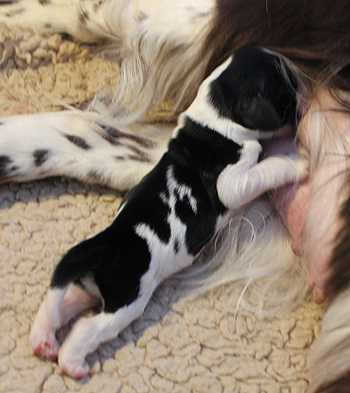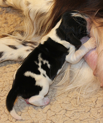 Am Freitag in der Früh war Laras Körpertemperatur auf 37,1 Grad gesunken. Da sie in den Folgestunden um 37,3-37,5 Grad schwankte hielt ich dies erstmal noch nicht für den tatsächlichen Geburtsbeginn. Lara zeigte auch kaum Verhaltensänderung hatte weiter Mordshunger, aber zitterte manchmal leicht. Am Freitagabend zeigte das Thermometer wieder 38,3 Grad, aber nun war Lara deutlich unruhiger, zitterte mehr, leckte sich. Die Nacht war noch ruhig aber Morgens um 09.15 Uhr zeigte sich an Laras Schnalle eine grüngefüllte Blase und nach dem diese aufging passierte erstmal nichts. Lara putzte sich natürlich ausgiebig, aber es gingen keine Presswehen los. Eine Weile wartete ich noch ab, aber es kam ohne Presswehen immer mal wieder grüne Flüssigkeit. Meine Tierärztin war übers Wochenende ausnahmsweise nicht greifbar und der Anruf in der Tierklinik in Werl die aufgrund eines fehlerhaften Narkosegerätes einen möglichen Kaiserschnitt ausschliessen mußte, liessen mich dann schließlich in Begleitung meiner Muttter nach Ahlen zur Tierklinik aufbrechen. Lara war Gott sei Dank trotz des ganzen Stresses absolut fit und machte den ganzen Diagnoseapparat aus Untersuchung, Röntgenbildern und Ultraschall klaglos mit. Der Ultraschall zeigte uns dann leider, dass der eine Zwilling keinen Herzschlag mehr hat und wir entschieden uns für einen schnellen Kaiserschnitt, um Pitufo, dessen Herz kräftig schlug, in die Welt zu holen.