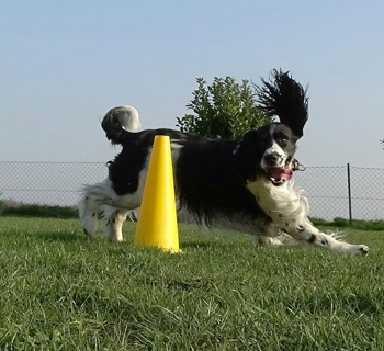 Es gibt jede Menge gute Neuigkeiten aus unserer Wurfkiste. Die Wichtigste zuerst: Pitufo läuft. Selbstständig. Ausserdem tut er was Welpen in dem Alter machen, er übt Bellen und Knurren und Wedeln. Er nimmt alles in das kleine Mäulchen (man kann schon die Zähnchen im Zahnfleisch fühlen) und probiert seine Umwelt. Er kann jetzt hören und sehen und auf dem Weg zum Hund ist es jetzt nicht mehr weit. Sicherlich wird er in nicht allzu ferner Zukunft mal genauso um die Pylone fegen wie sein Papa auf dem letzten heutigen Foto (aus der Kamera von Birgit Funk).