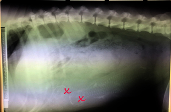 Allen die beim Röntgen mitgefiebert haben ein dickes Dankeschön! Weiterhin brauchen wir alle Daumen, dass die Zwillinge die auf dem Bild erkennbar sind auch frisch und munter in der Wurfkiste ankommen. Wir freuen uns verhalten, dass es doch zwei kleine P´s sind und hoffen und hoffen, dass für beide alles gut geht.