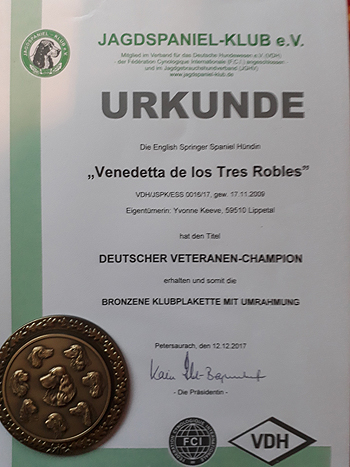 Für Lara kam gestern schöne Post vom Jagdspaniel Klub. Sie wurde im Handumdrehen (drei Ausstellungen) zum Veteranen Champion ernannt.