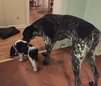 Resis neue Welpeneltern haben eine kürzere Anfahrt, sind aber nicht weniger aufgeregt. Freitagmorgen vor dem Dummytraining wird die kleine Schwarze abgeholt und ab da muß Kira sich an Ylvi halten bis auch ihre Zweibeiner da sind.