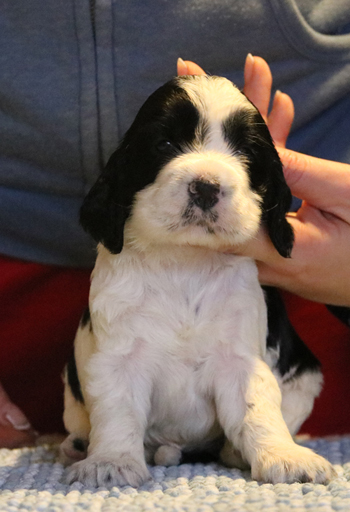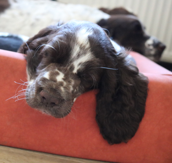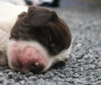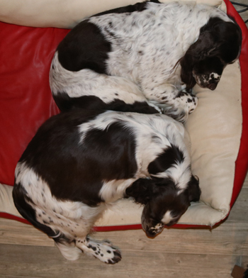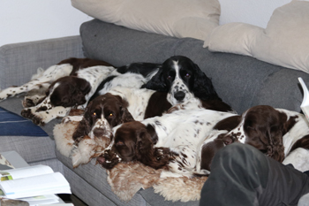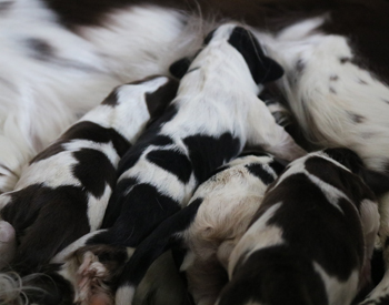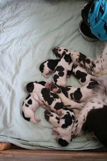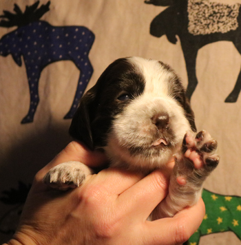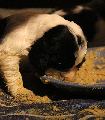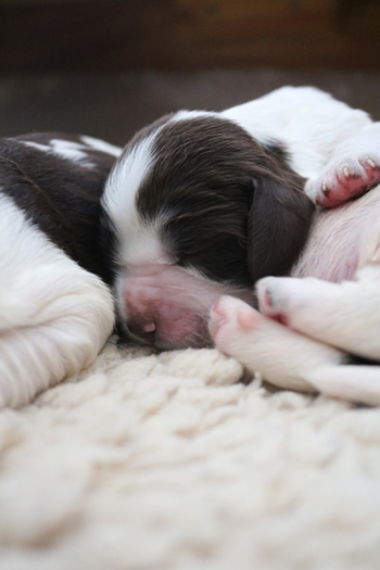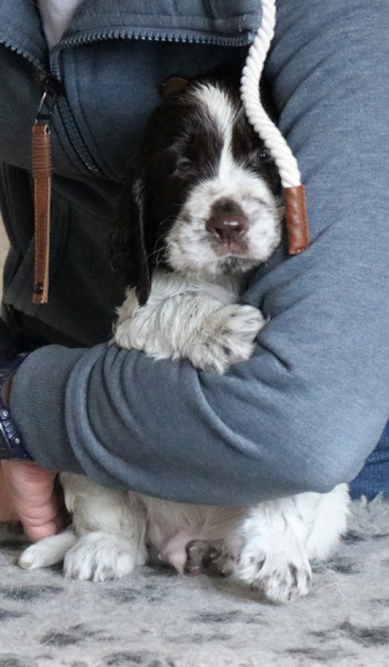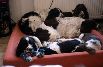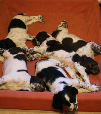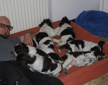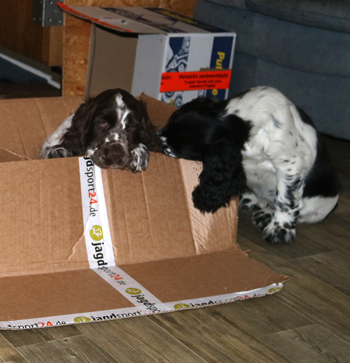 Der zweite Autoausflug den ich im ersten Satz schon angerissen habe war für die Welpen eine schöne Erfahrung: In unserem nahe gelegenen Wäldchen hat es nach dem Sturm Friederike doch einige Schäden und somit jede Menge Dickungen zum erkunden und toben. Kurz vor Ende des Ausflugs hies es "Food, food, food" und man fand eine spannenede Stelle mit von mir ausgelegten Futterbröckchen zwischen Ästen und Laub. Spanielnasen in ihrem Element! Die Rückfahrt war genauso unspektakulär wie die Hinfahrt, kein Pieps kam aus der Autobox auf dem Rücksitz. Zuhause gab es dann nach dem gründlichen abrubbeln von sieben Welpen die volle Portion Vier-Uhr-Tee. Beim abendlichen Besuch von Lemmys neuer Familie war es doch erstaunlich ruhig in der R-äuberhorde. Die Mädels verschliefen den Besuch weitestgehend, und die Jungs waren nur halbherzig aktiv.