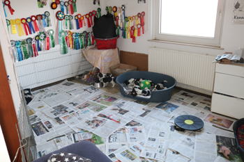 Die Wurfkiste ist ausgezogen, der Auslauf ist größer. Die Umstellung hat bei den Zwergen wieder zunächst zu Entdeckergeist und umgehend danach zu tiefem Schlaf geführt. Das aktuelle Lebensalter der R-äuberlein verlangt nach wohldosiertem Input, und so geht es jetzt Schritt für Schritt weiter.